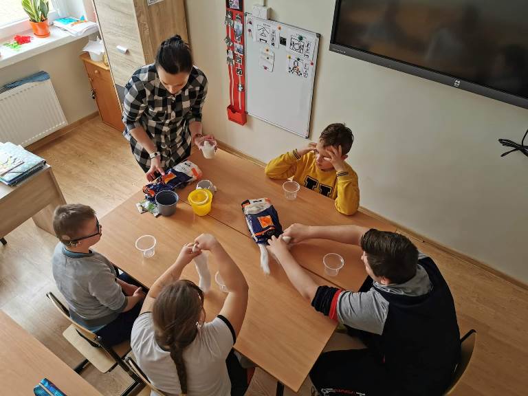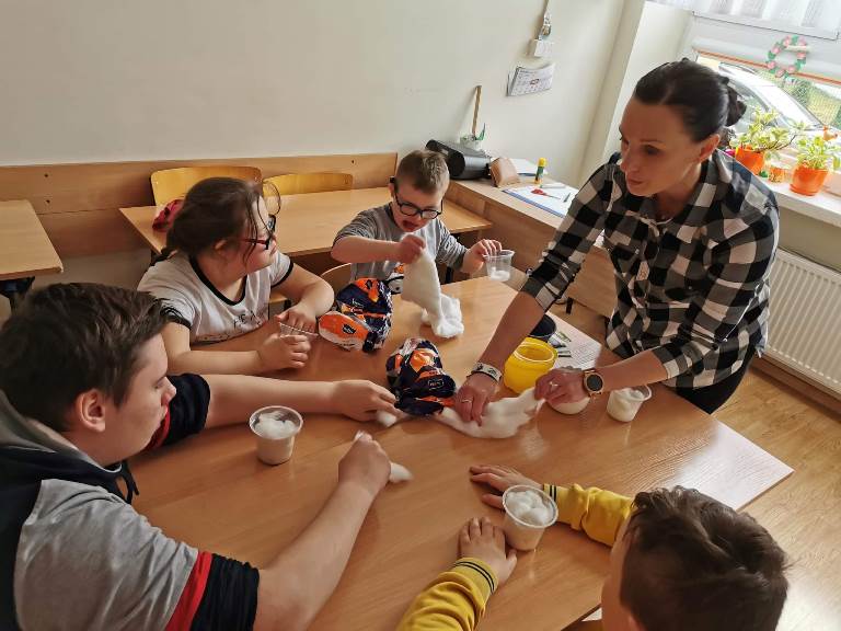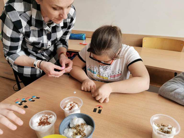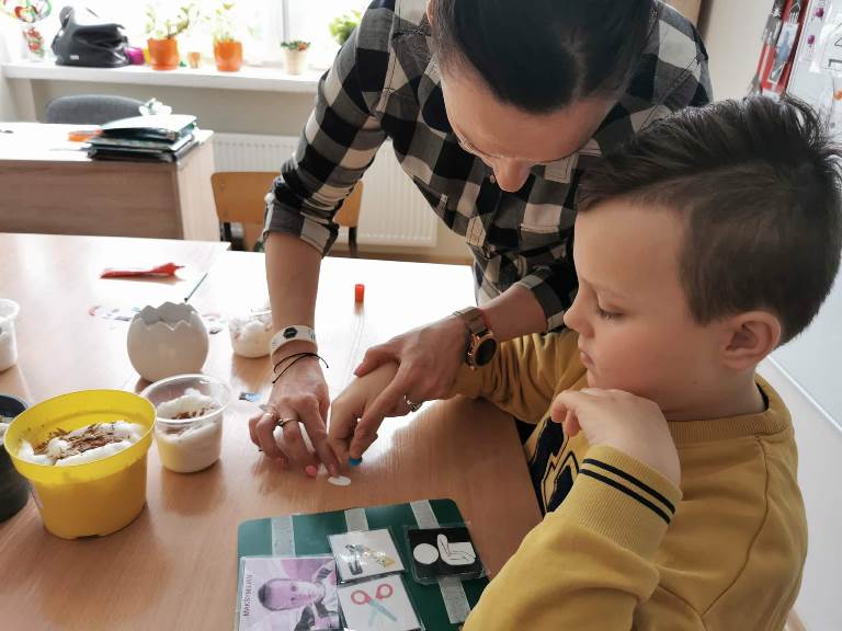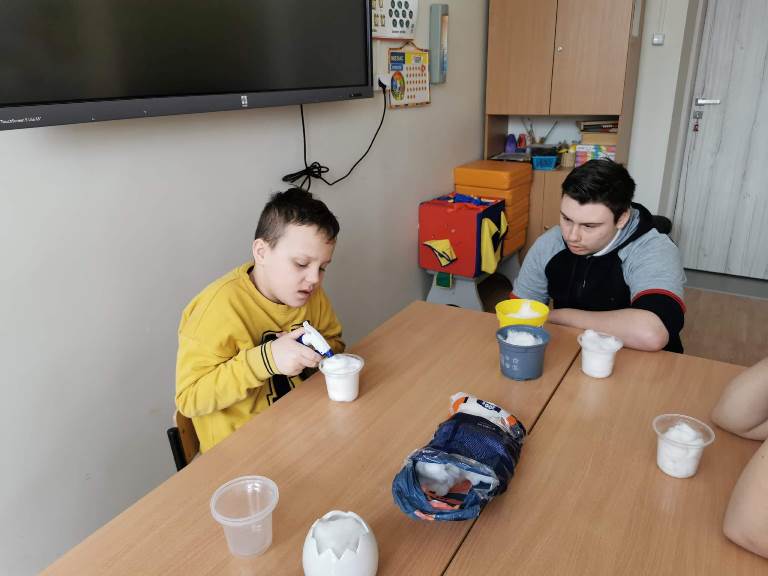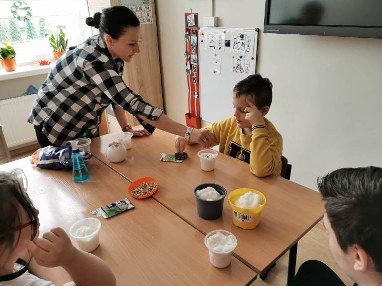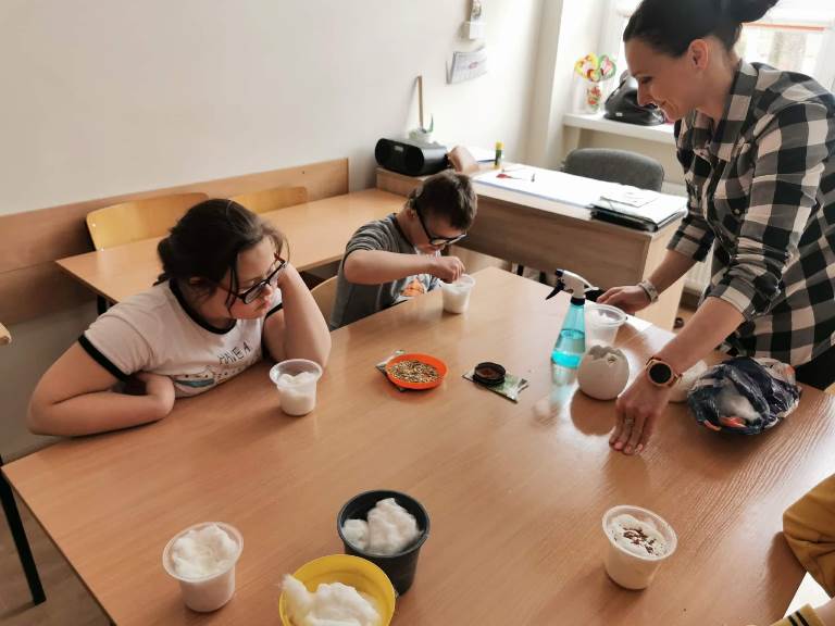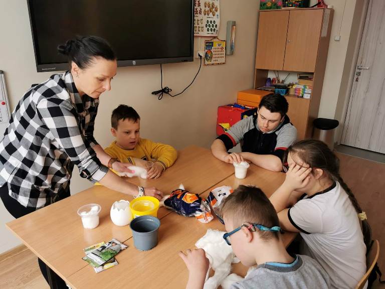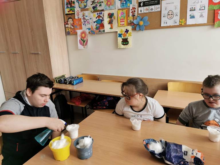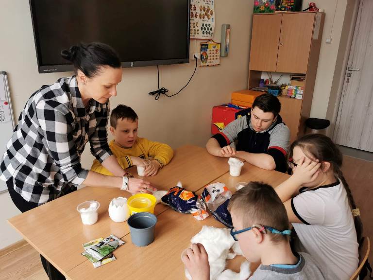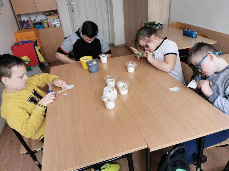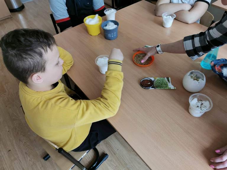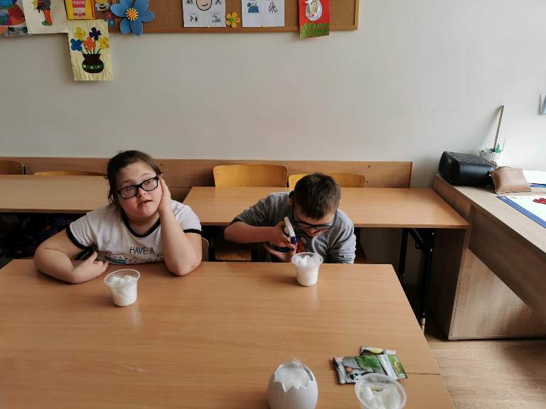 Najmłodsi uczniowie naszego Ośrodka w związku ze zbliżającymi się Świętami Wielkanocnymi na dzisiejszych zajęciach posiali rzeżuchę i owies. Wykonane przez nas stworki będziemy codziennie zraszać i mamy nadzieję, że szybko zakiełkują i urosną by być ozdobą naszych stołów Wielkanocnych.