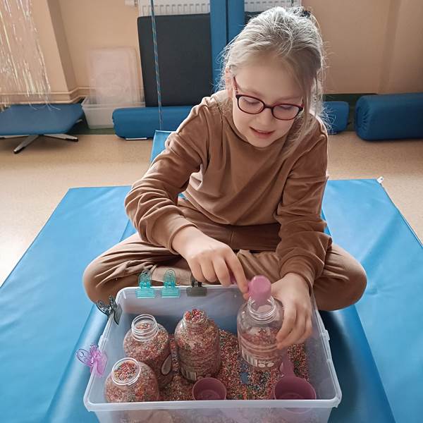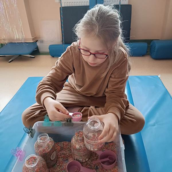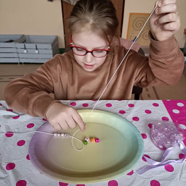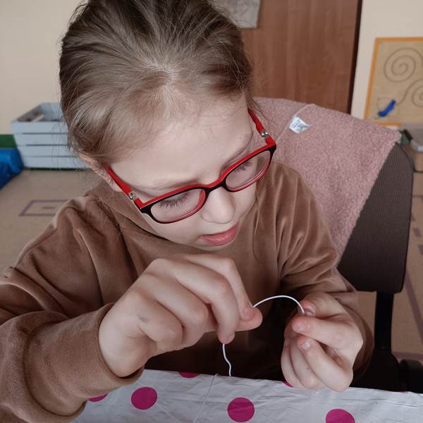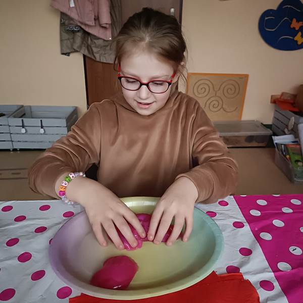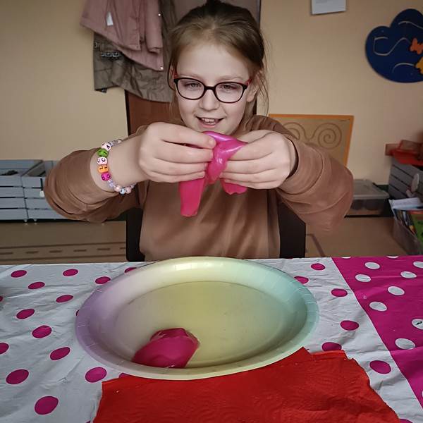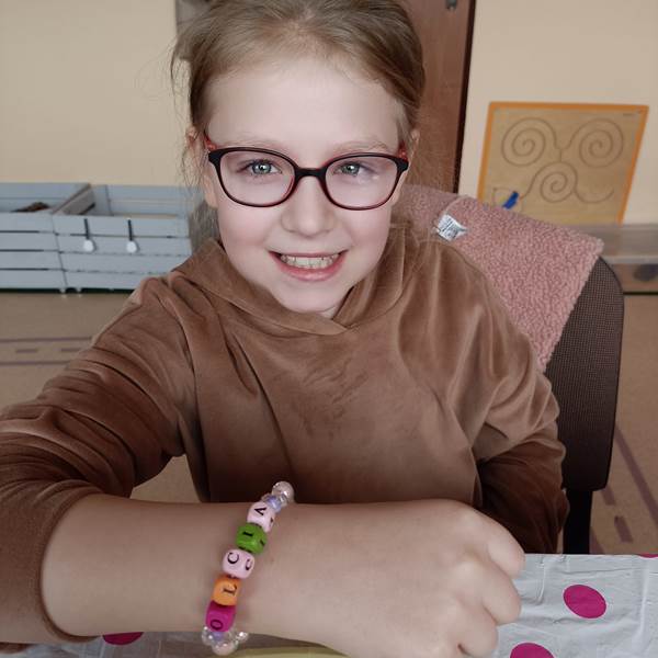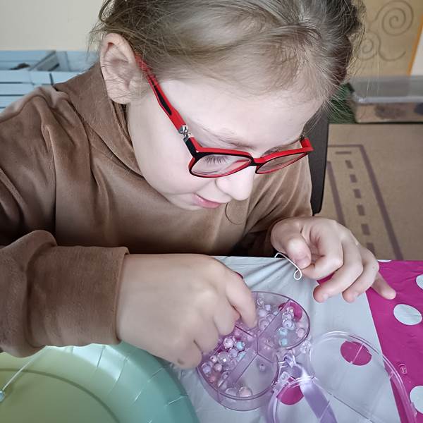 Dziś podczas zajęć usprawnialiśmy motorykę małą dzięki zabawie slimem, przesypywaniem kolorowego ryżu, a wisienką na torcie było stworzenie własnej spersonalizowanej bransoletki