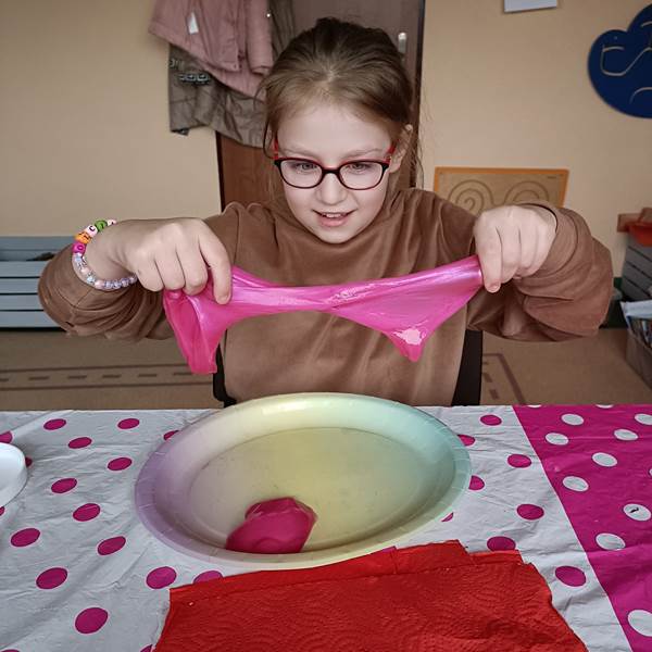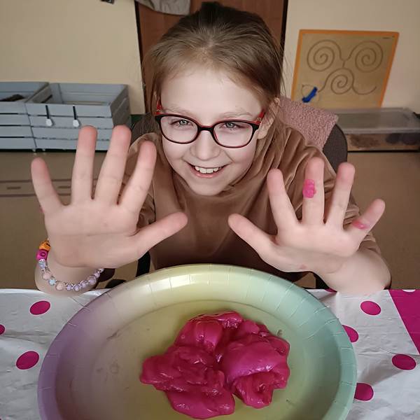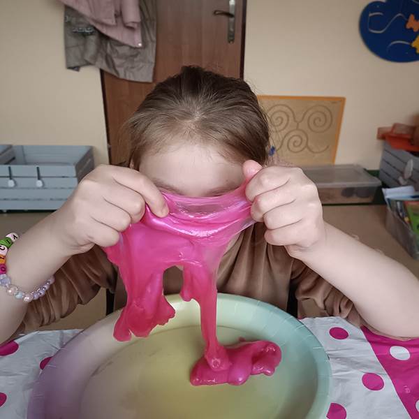 Slime jest uwielbiany przez dzieci i jest to świetna zabawa sensoryczna. Rozwija percepcję dotykową, wzrokową, a jeśli pięknie pachnie, także węchową. Stanowi doskonałe narzędzie do odwrażliwiania dłoni, a dzięki swojej konsystencji jest bardzo interesujący. Podczas zabawy rozwija się mała motoryka- slime można nie tylko ugniatać i rozciągać, ale też toczyć, układać w różne kształty